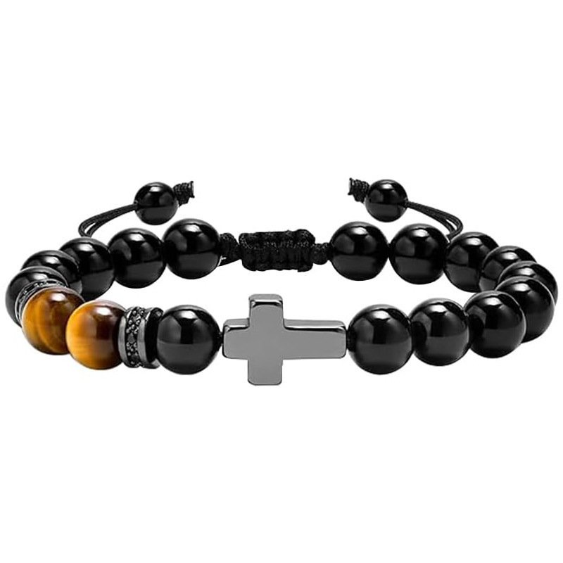 This bracelet features 8mm black obsidian beads combined with 8mm tiger’s eye stones and a cross charm. Black obsidian is known for its grounding and protective properties, while tiger’s eye is believed to support confidence and inner strength. Designed for comfortable everyday wear, this bracelet symbolizes protection, balance, and strength, making it suitable for daily use or as a meaningful gift.